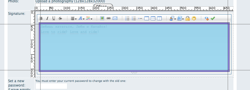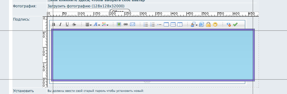 В Профиле пользователя: <textarea class="editor markItUpEditor" cols="58" rows="8" name="rusertext" style="width: 528px;"/>Вот так всё стаёт на свои места На этом сайте всё ок. На этом сайте по прежнему Тумбы добавляются в конец текста. + При удалении файла в папке пользователя выкидывает в корень