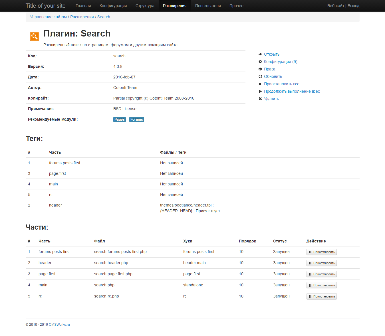 Плагин Search коробочный, просто модуль Projects его расширяет под поиск проектов. Код, кодорый должен добавлять доп.поля для поиска в модуле присутствует, но работает ли он корректно не проверял. https://github.com/macik